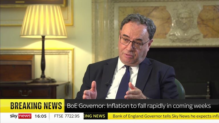 The governor of the Bank of England has told Sky News he expects inflation to fall “rapidly” in just weeks – but warned two thirds of the pain from interest rate rises is yet to come.